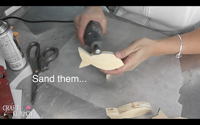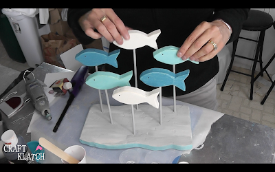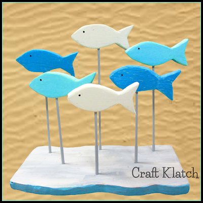 8. Paint them any colors you want. I mixed a gray and oyster white for the top of the base. I used a turquoise as a trim. I painted the fish white, blue and turquoise, but be sure to customize them to your decor and style!