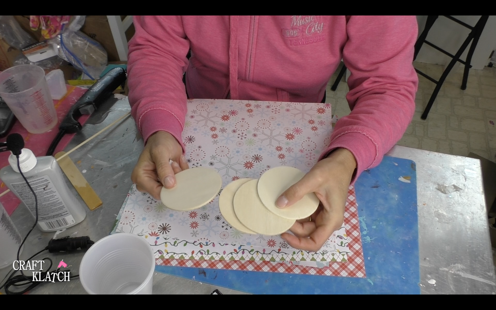 1. Gather your wood discs and your scrapbook paper.  I went with a Christmas theme, but you can do any holiday, or to fit any decor.