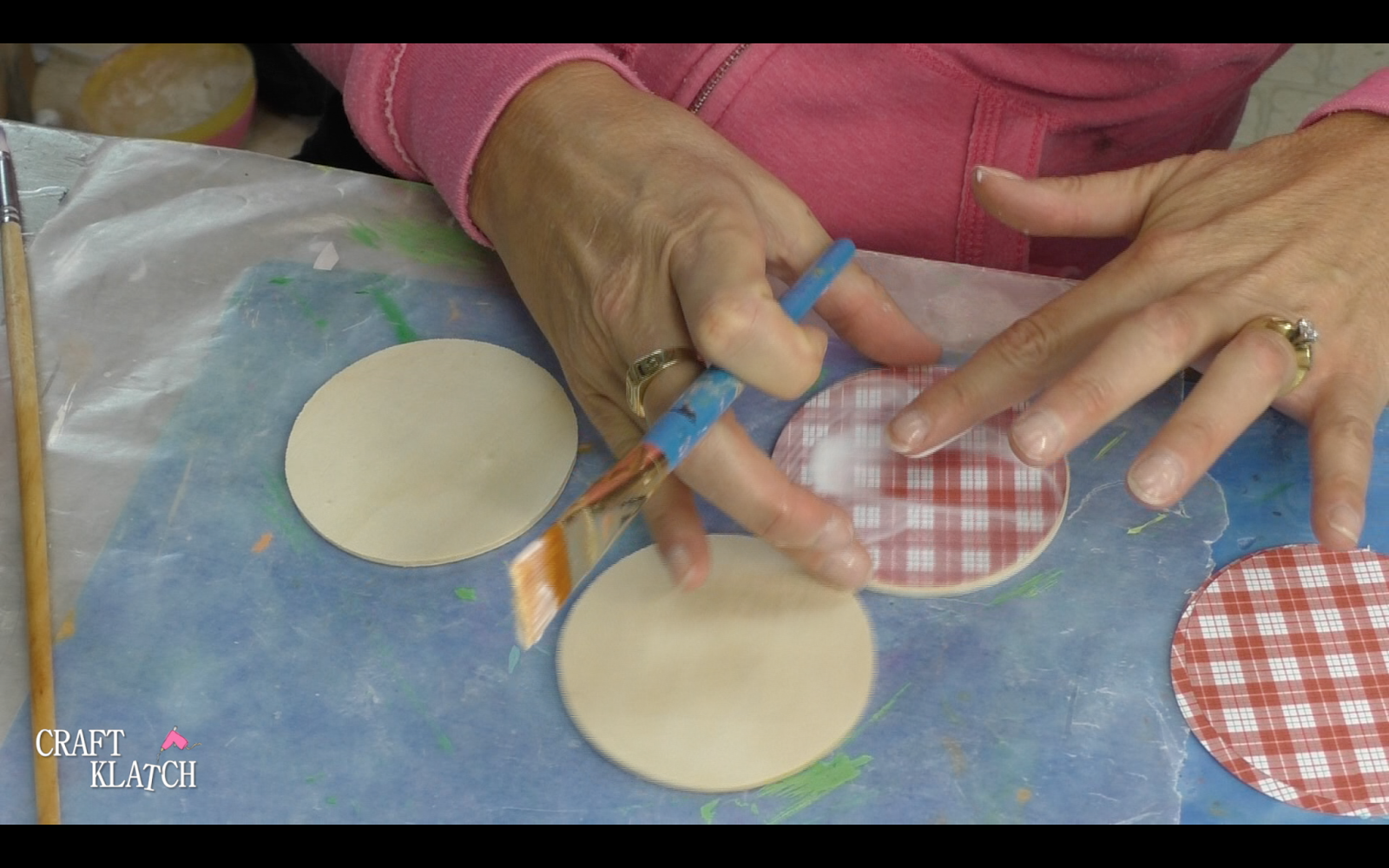 5.  I then put the paper on the wood disc, put some Mod Podge on my finger and then rubbed the paper down – to get rid of any bubbles.