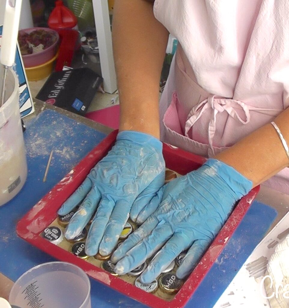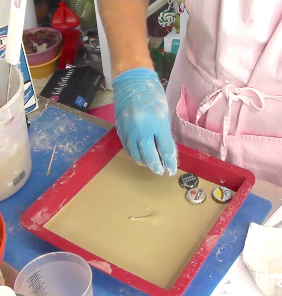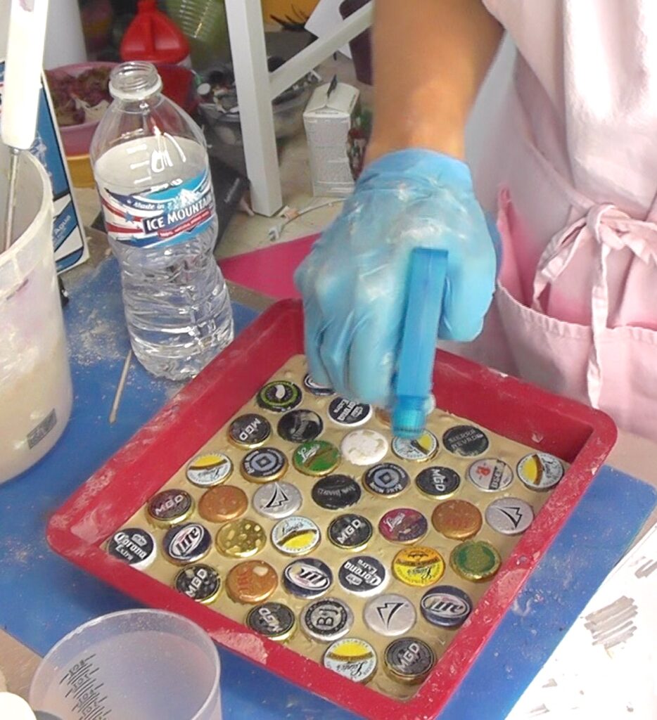 4. Once you have the beer bottle caps placed, press them in, so they make a level surface. You don’t want them uneven, or things will lean or fall over. Wipe any excess concrete or cement you may have gotten on the bottle caps.