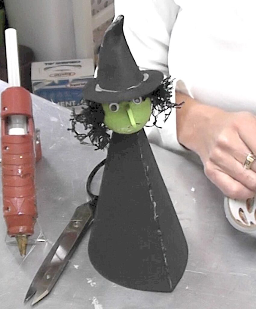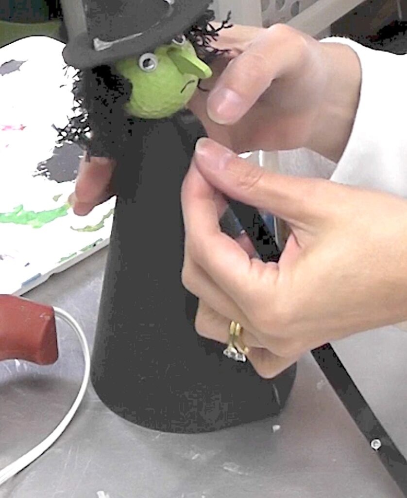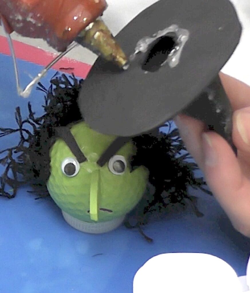 Glue on the hair. I used some trim I had on hand. You can use any color hair for this witch craft and you can make her look as happy, angry, or grim as you like!