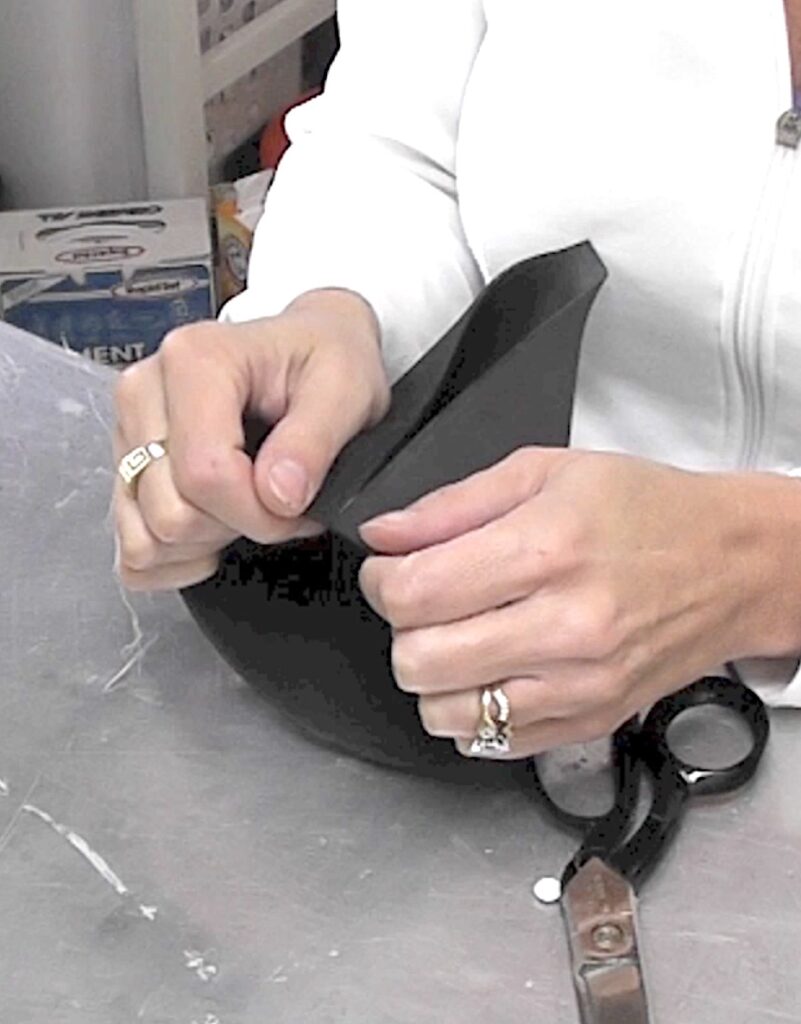 Fold the circle in half and in half again. Cut a small piece of the corner out and that will give you a hole right in the middle. The hole helps the hat sit more securely on the head and also allows the eye screw to fit through.