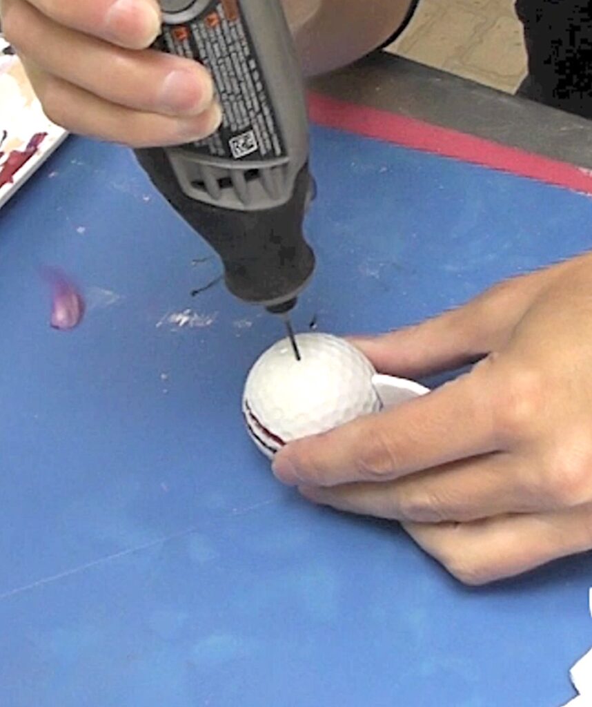 If you want to hang her (or only want to make the head), drill a small hole into the top of the golf ball. Then, insert an eye screw. Remember, if you are planning on hanging it, make sure you tie some string or fishing line to the eye screw before you attach the hat. Also, make sure you thread it through the top of the hat before you glue the hat in place.