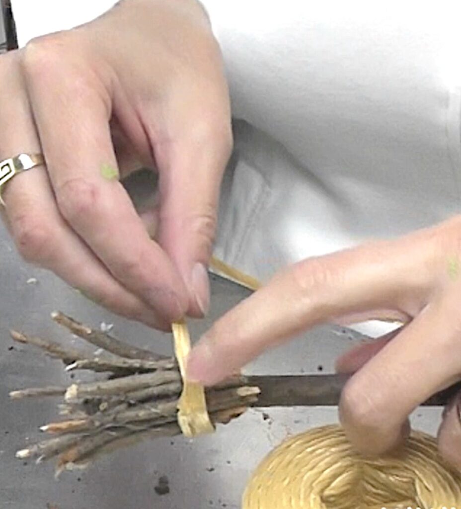 Now it’s time to make the broom. Find some twigs – a bigger one and a bunch of small thin ones. Break the larger twig to the size of the broomstick and break the smaller ones to the size of the bristles. Glue the smaller ones to one end and put a ribbon or twine around them.