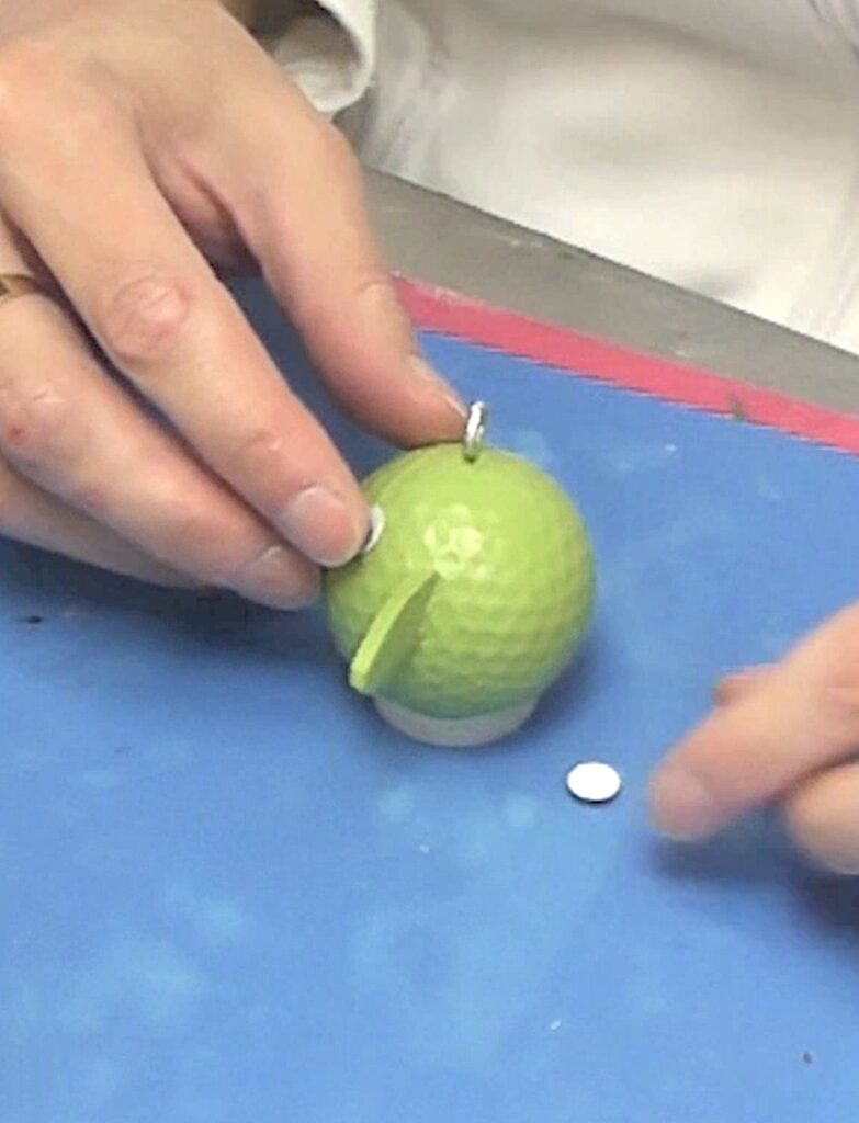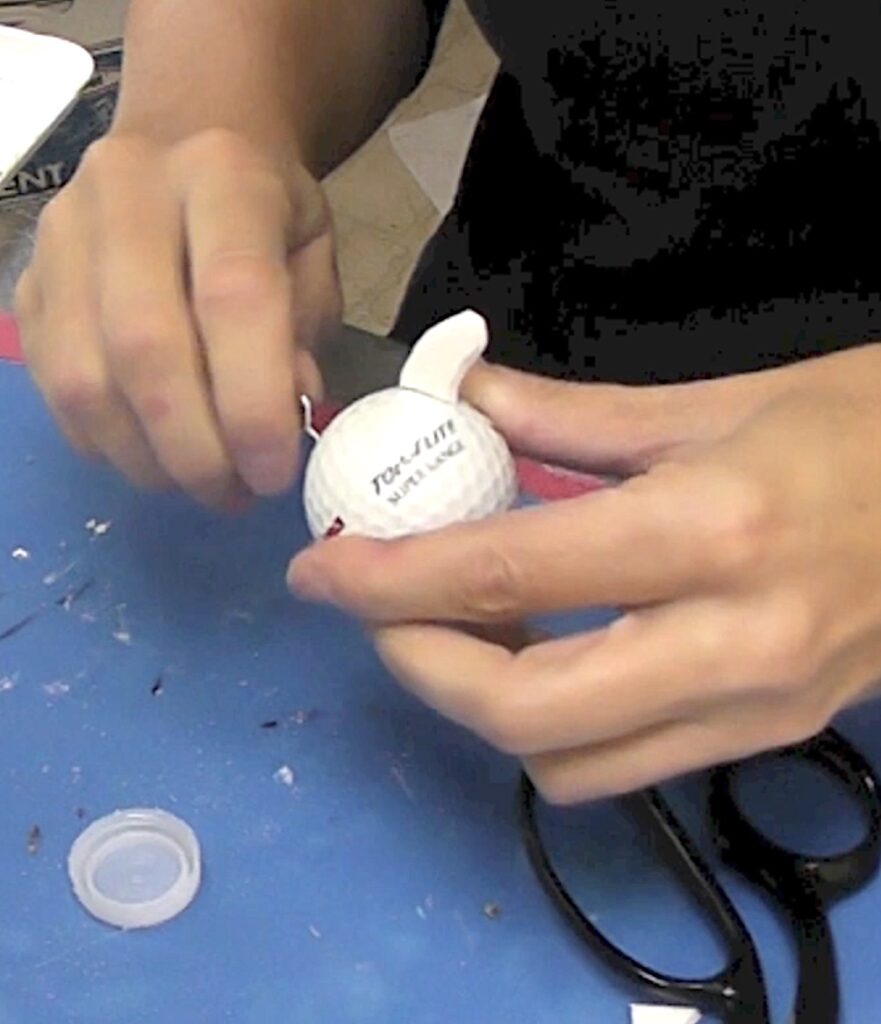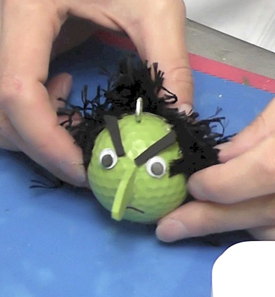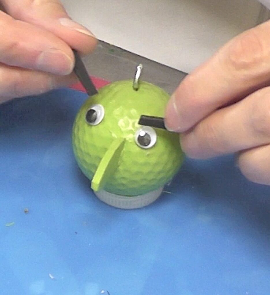 Cut a nose out of craft foam and glue it onto the golf ball.