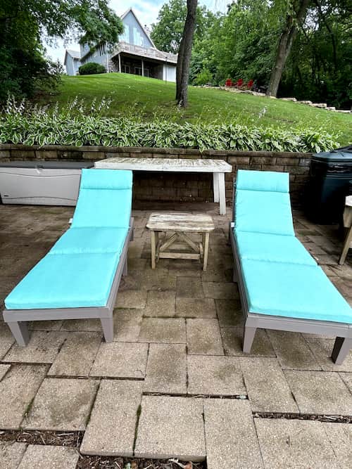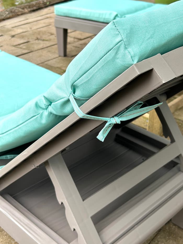 You can find the chaise lounge pads that we bought HERE. I’m a stickler for reading the reviews and they had 4.5 out of 5. They are water-repellant and fade-resistant. Both are good qualities.