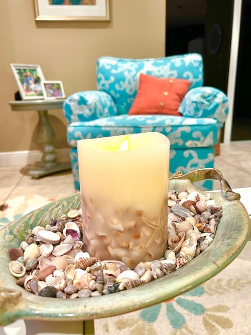 I have a battery-operated shell candle in a dish with tiny shells to accent, on my coffee table.