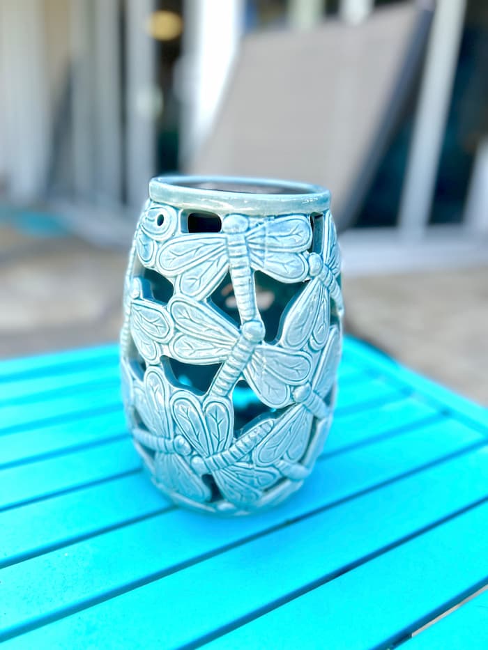 Every outdoor area needs a little mood lighting. Illuminate your evenings with a dragonfly solar light on an outdoor side table.
