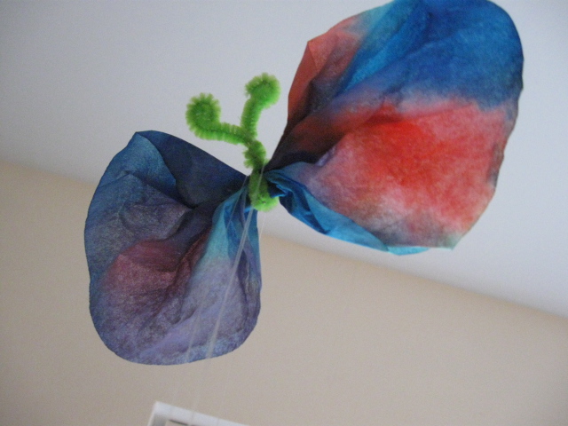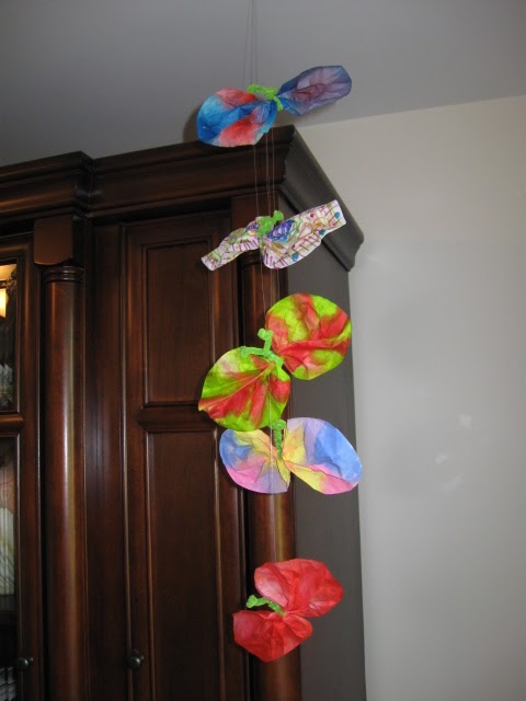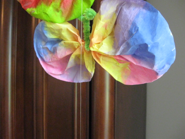 Do an accordion fold and fasten together with half a pipe cleaner. Twist the ends for antennae. Attach fishing line and hang around the house!