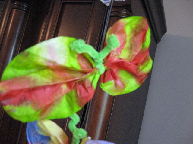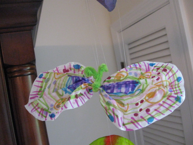 Decorate the coffee filters with either markers or really let the kids have fun and let them paint with watered down food color! Let them do it outside before lunch and by the time lunch is over, they coffee filters will be dry and ready to make the butterflies!