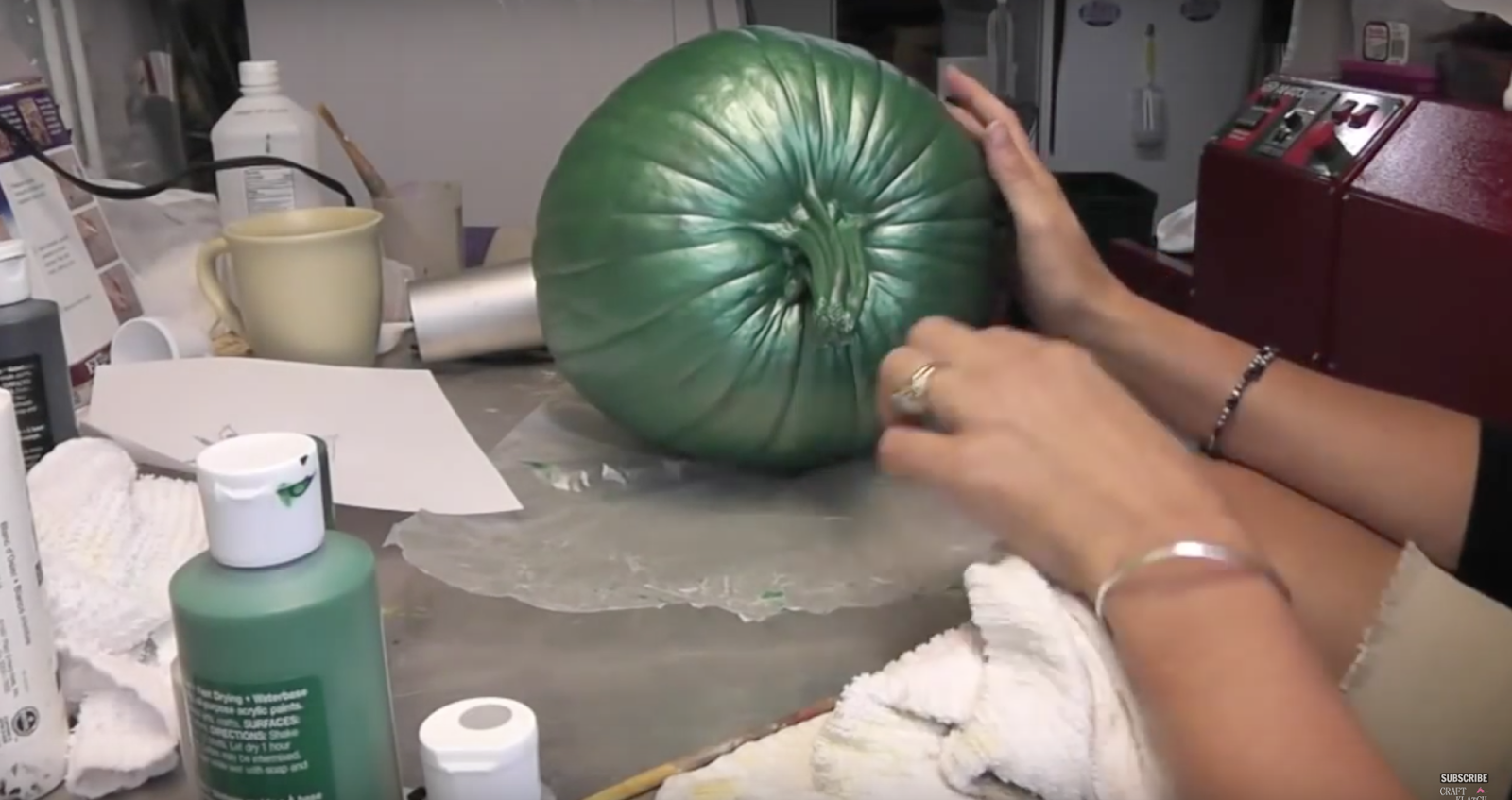 Give your pumpkin green metallic flair. I used a mix of green, metallic green, metallic white, and metallic silver. Don’t worry about exact measurements. I just put a bunch of the different colored paints on my palette and mixed them together until I got the color I wanted. Paint the entire pumpkin with that mixture and allow it to dry.