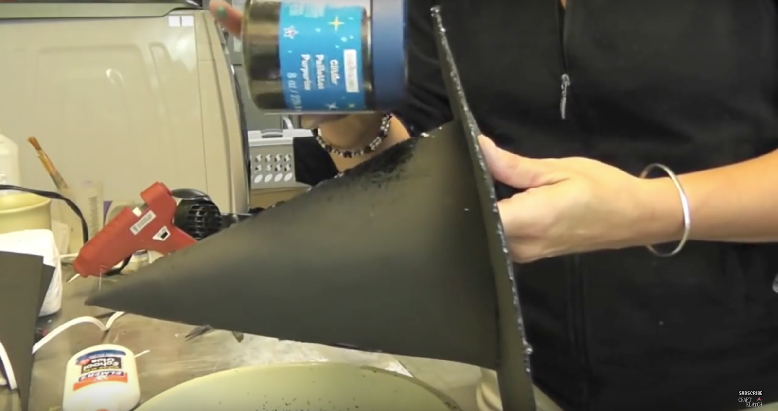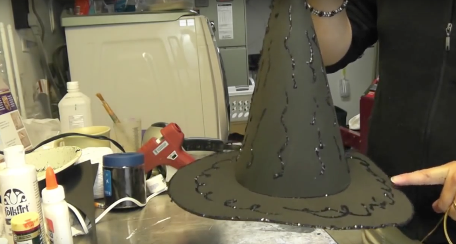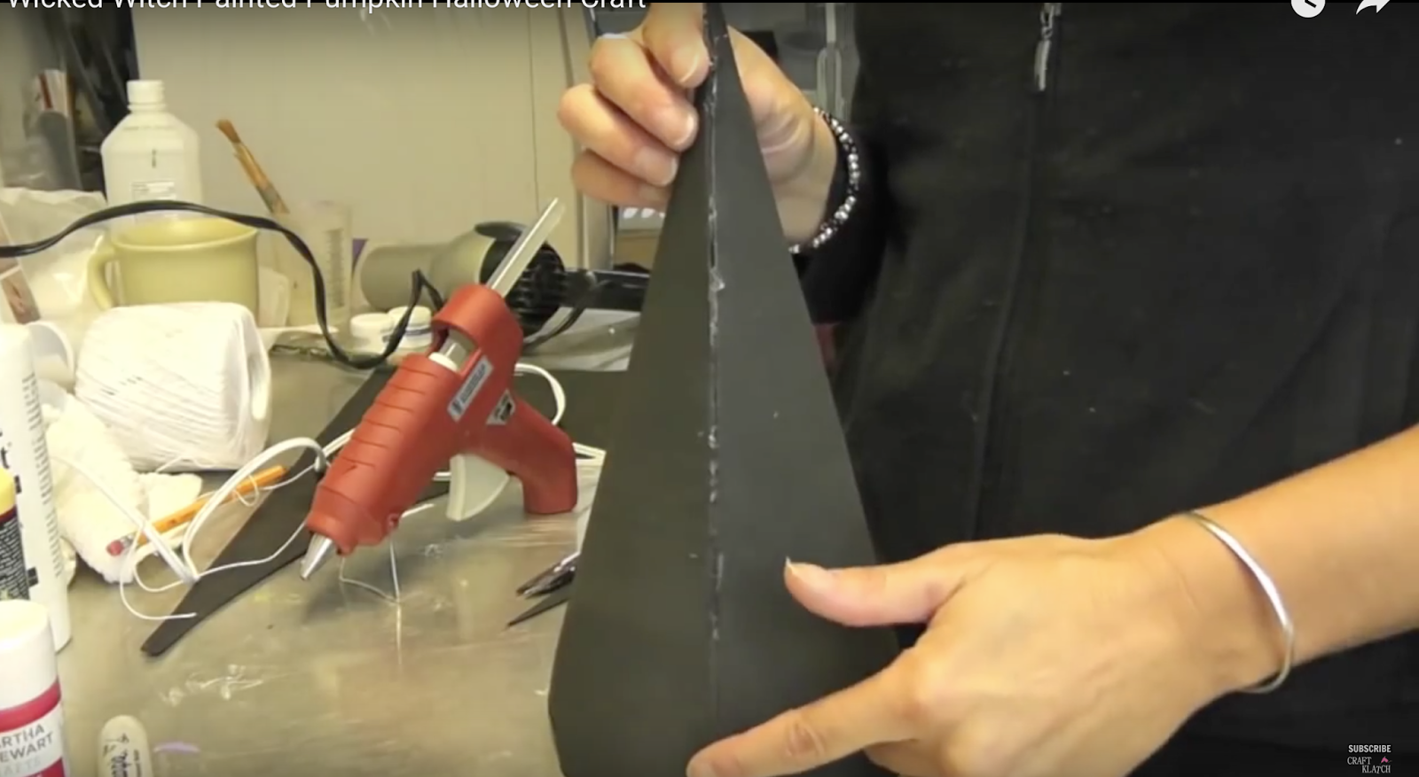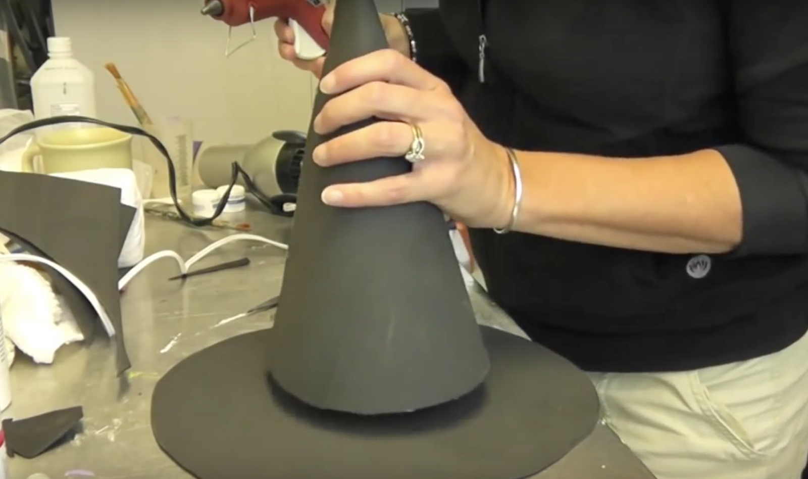 Create a cone and circle using craft foam, for the hat. I explain it further in the video. Also, HERE is a full Witch Hat Tutorial. Glue the two pieces together.