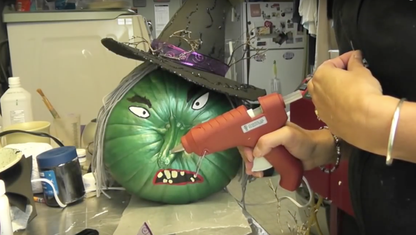 Glue it onto the top of the painted pumpkin witch head. Use lots of hot glue to keep it in place.