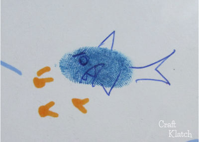 3. With a blue pen, draw fins, eye, tail, mouth and teeth.