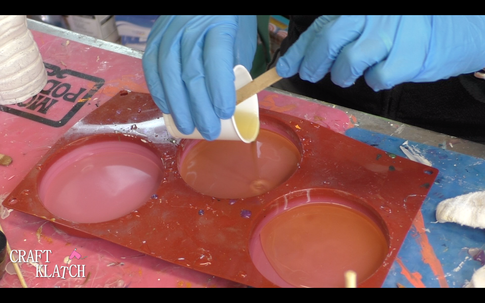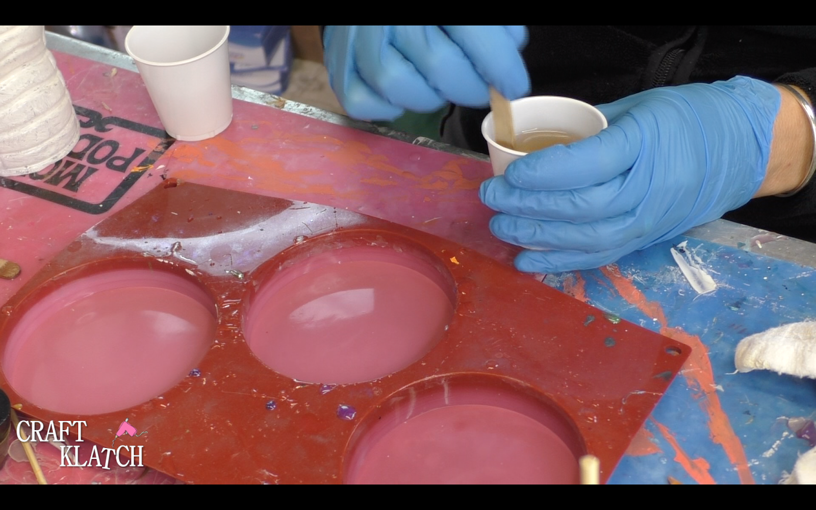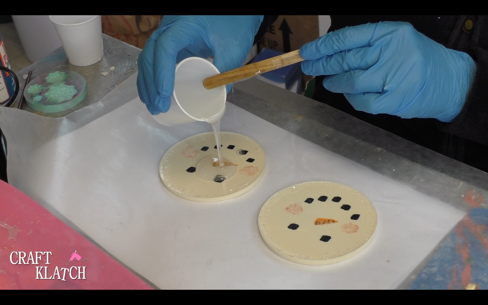Once everything has dried, pour one ounce of clear resin over each of the coasters. This will seal in the paint and the glitter.