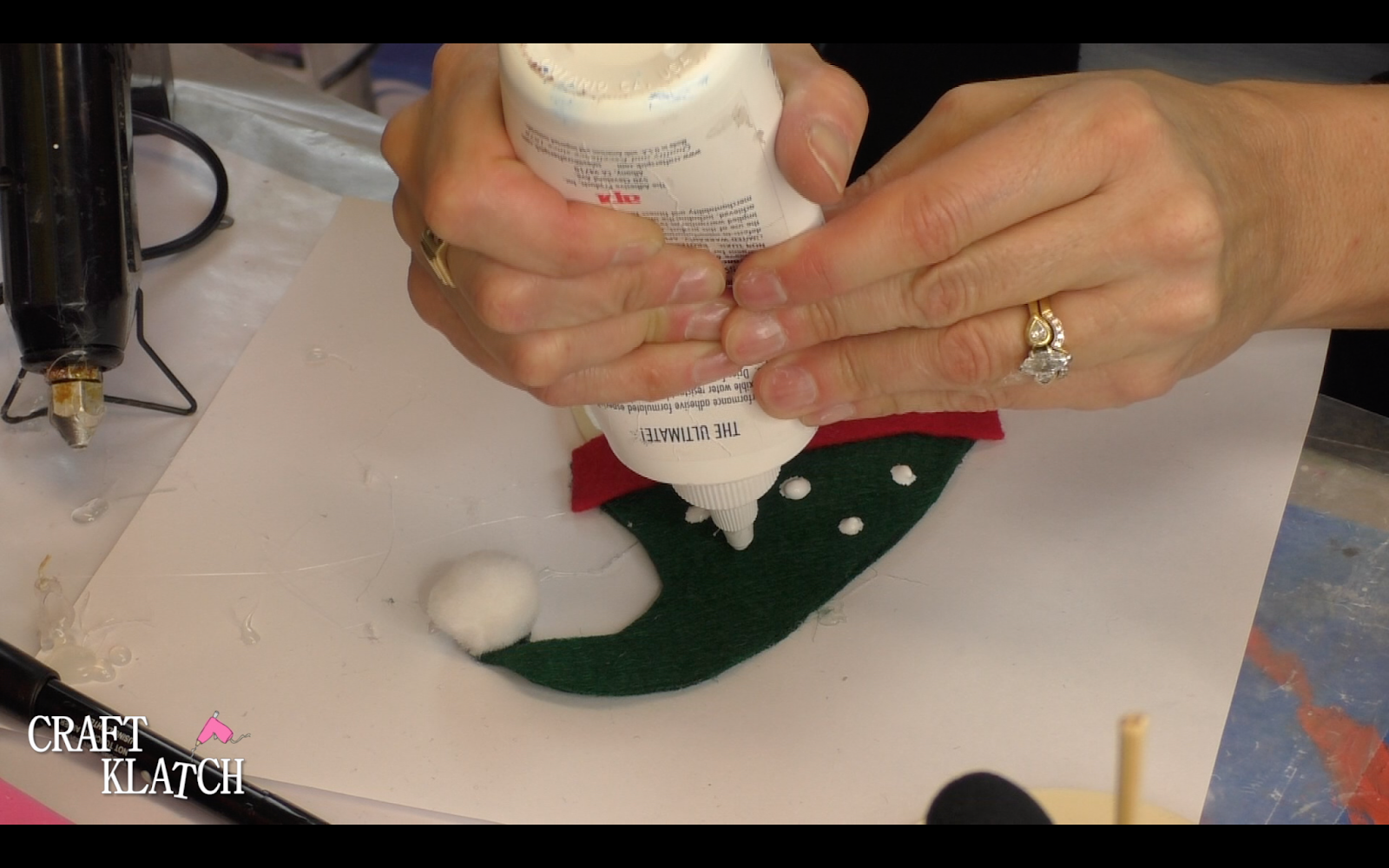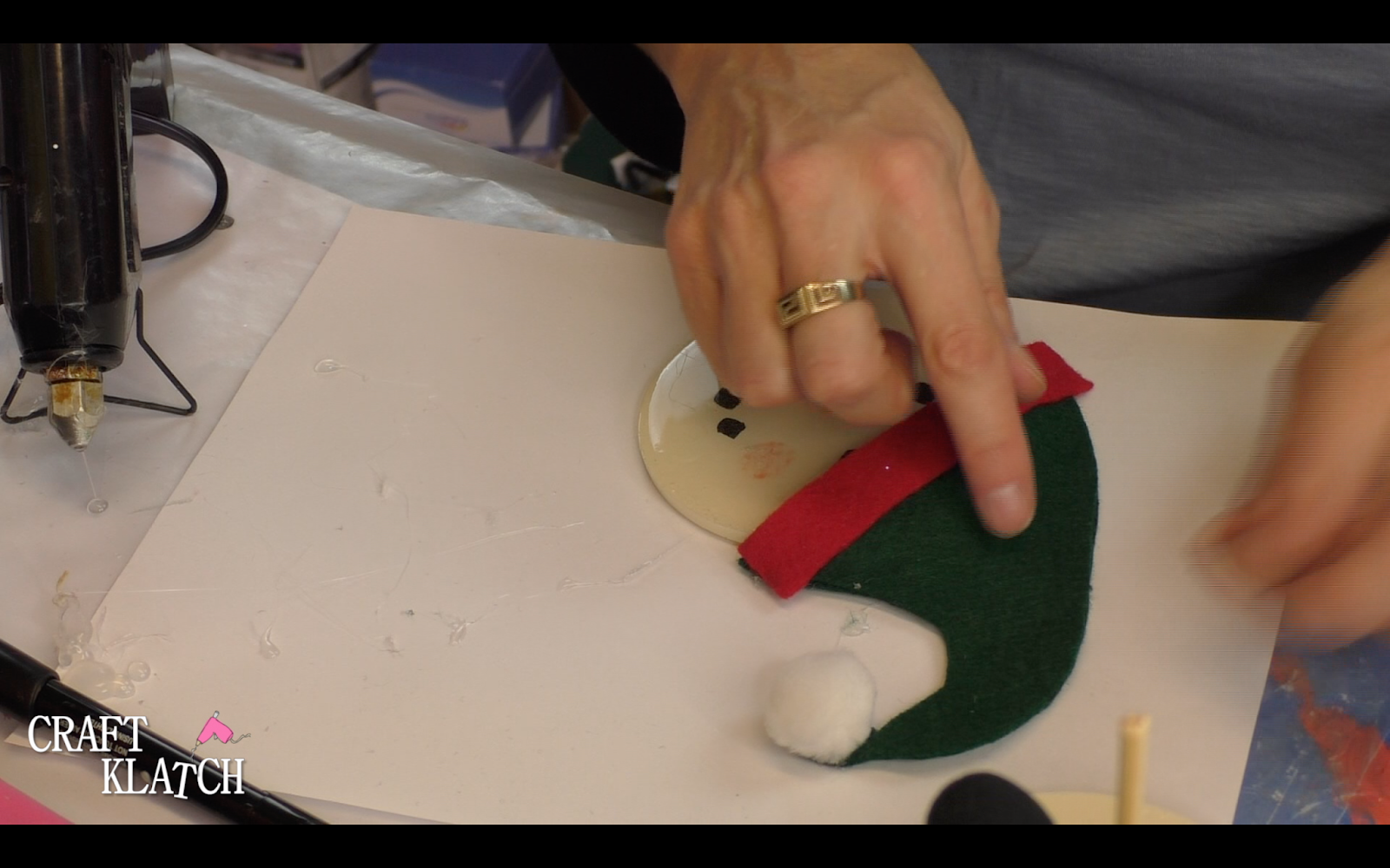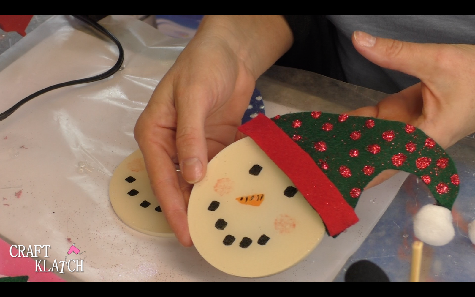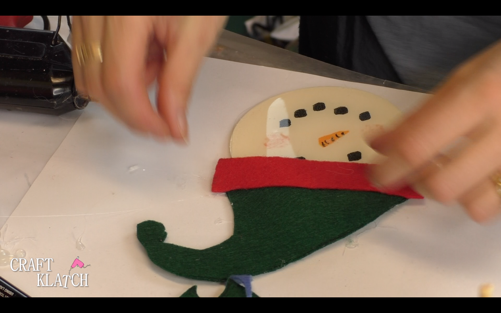 Cut a strip of red and glue it on as trim on the snowman cap. Also, glue on a pom pom on the end of the cap.