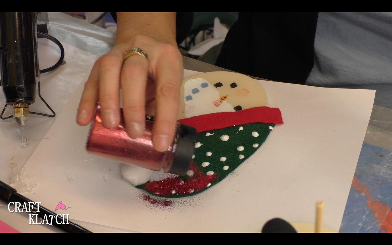 Paint clear drying glue onto the features and around the outer edge of the snowman craft and pour on chunky white glitter.