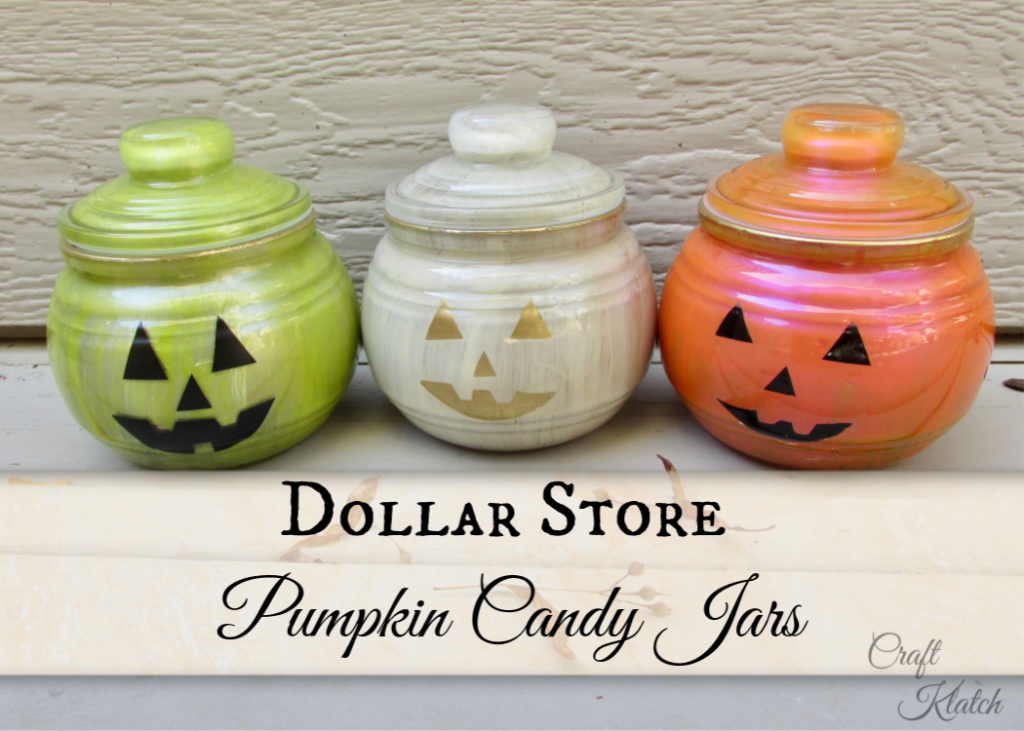 Dollar store pumpkin candy jar crafts in green, white and orange