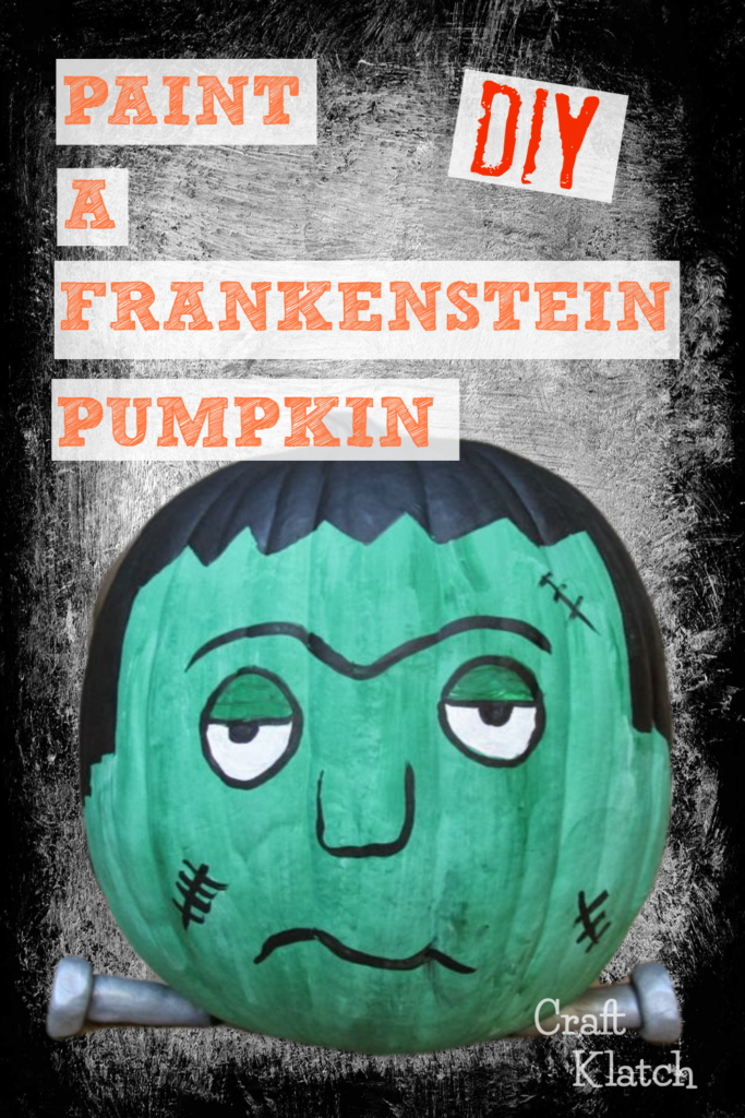 Frankenstein painted pumpkin craft with green face, black hair and silver bolts