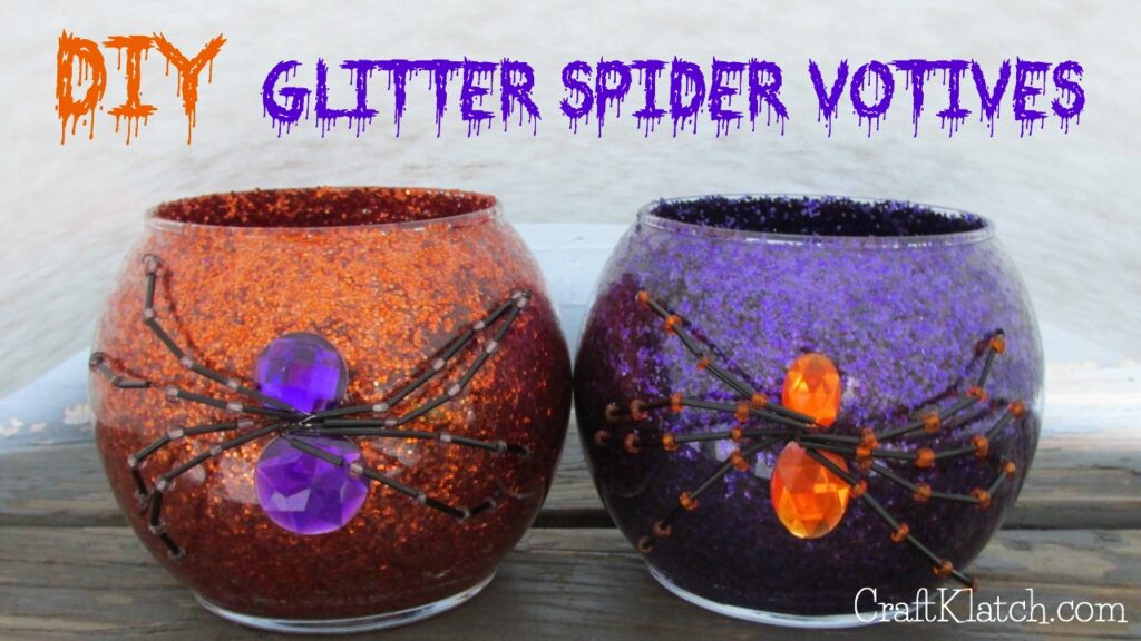 Dress up simple glass dollar store votives to make Glitter Spider Votives. Who says Halloween can’t be glam!