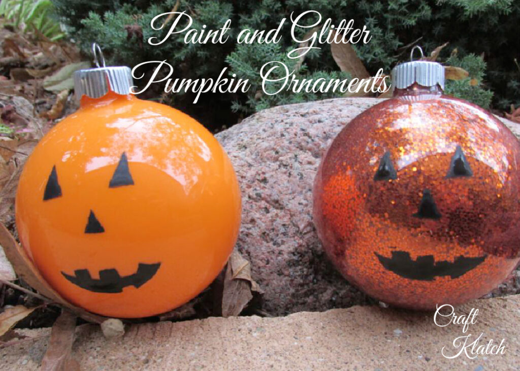 Two orange pumpkin ornament crafts  one with glitter and one with paint