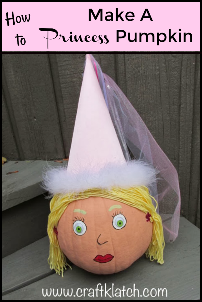 Princesses have obvious appeal. This Princess Pumpkin is super cute and the hair could be any color and the eyes could be any color. You can buy a pre-made hat, or there are directions on how to make the Princess Hat DIY, for the pumpkin, or for your Halloween costume!