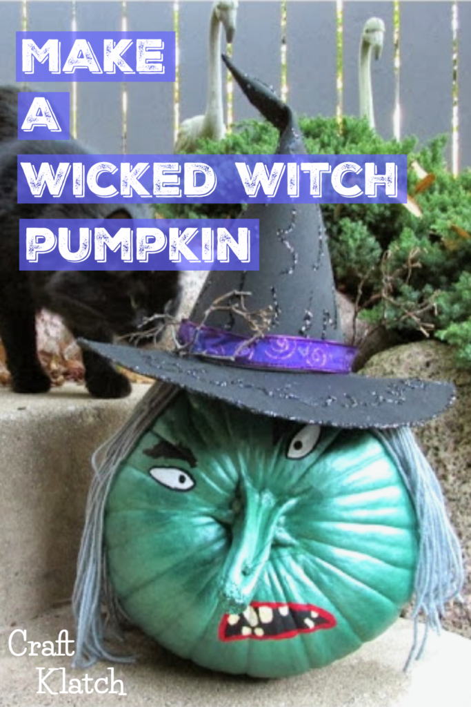 Green wicked witch painted pumpkin with gray hair and black witch hat and stem for nose fall crafts for kids