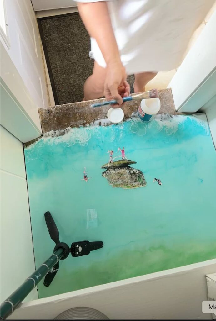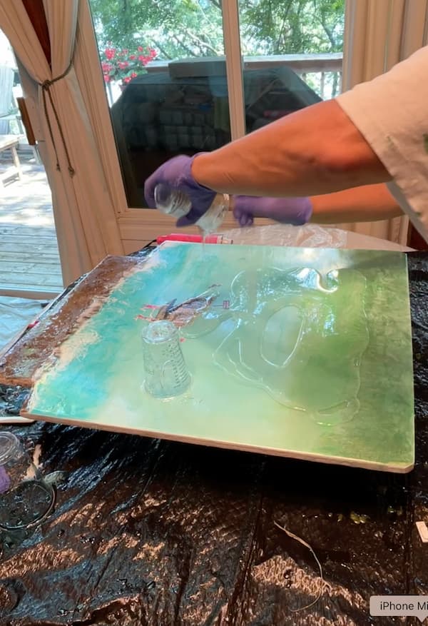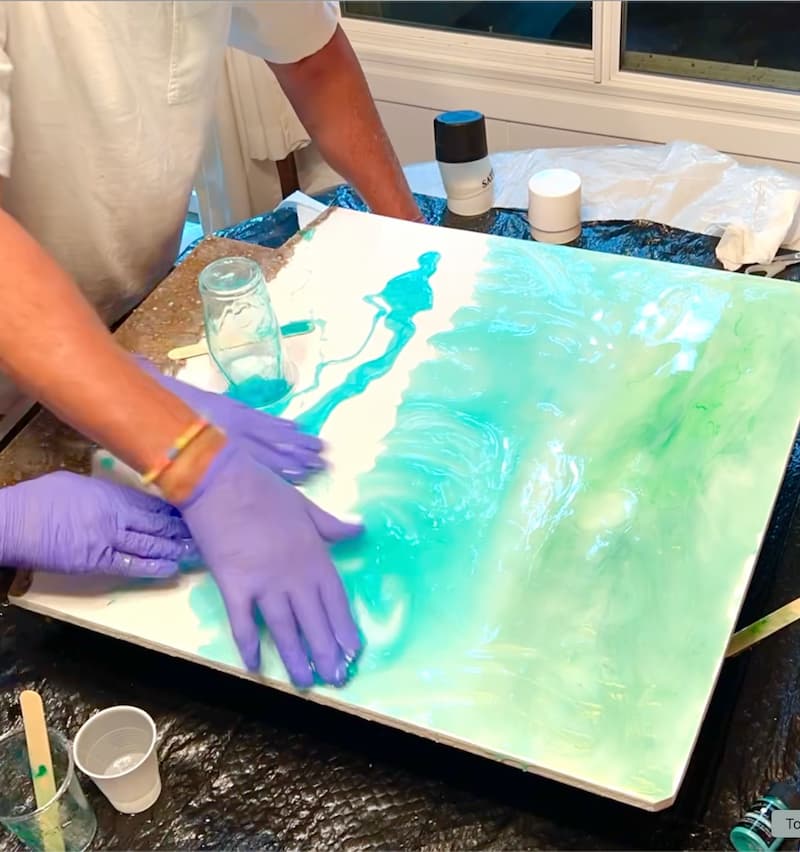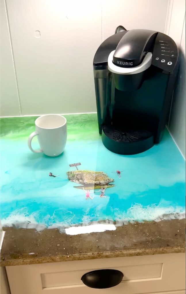 Because it was a quicker curing resin, I had Greg help me. We poured the green and blues on the countertops and blended them a bit. At the shoreline, where the blue met the sand, I ran a line of white and used my heat gun to create the wave effect.