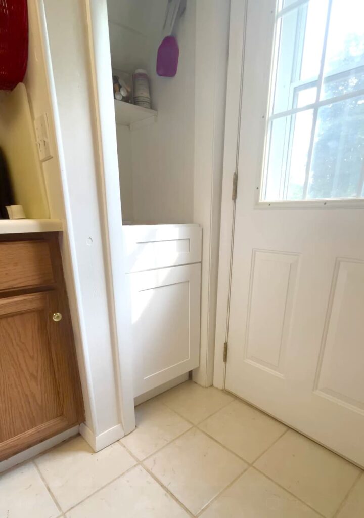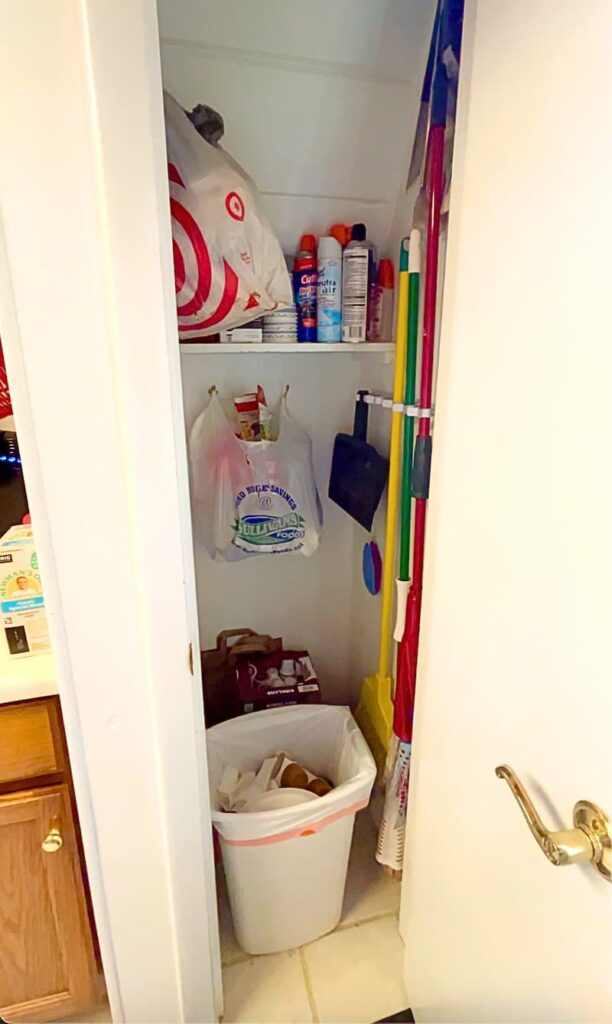 Broom closet with trash, brooms, bags, etc ready to be converted into a coffee bar cabinet
