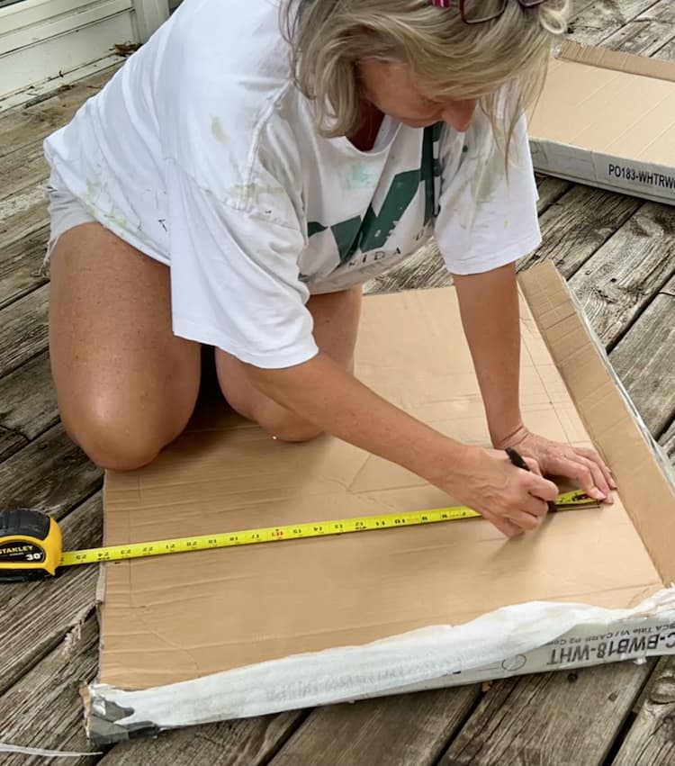 I used the cardboard from the cabinet packaging to make a template for the countertop, and Greg cut it out from 1/2″ plywood. I primed it and then the fun started…resin!