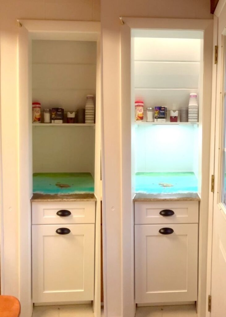 All the random stuff – brooms, sprays, traps – have been relocated. The space now holds only what we need: coffee, tea, and essentials.