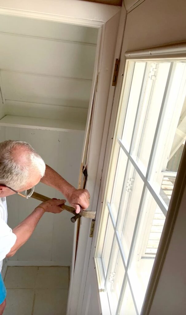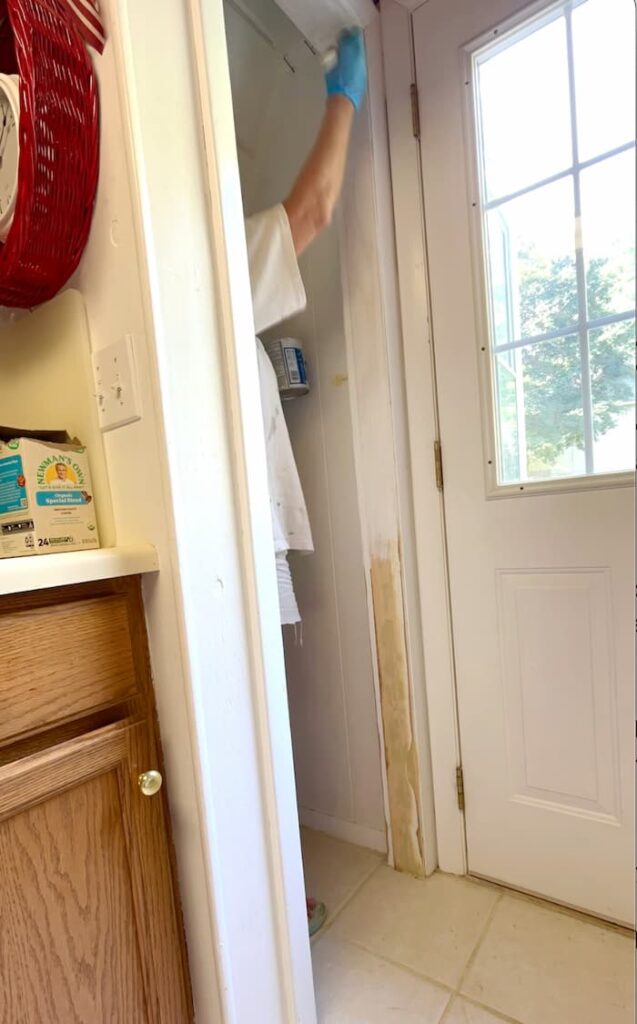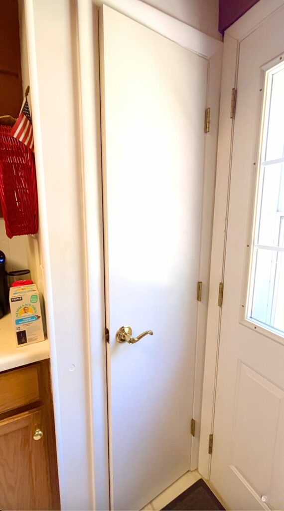The broom closet had been neglected for too long! First, I emptied everything out. I took down hooks, removed the door, and Greg removed the door stop.
