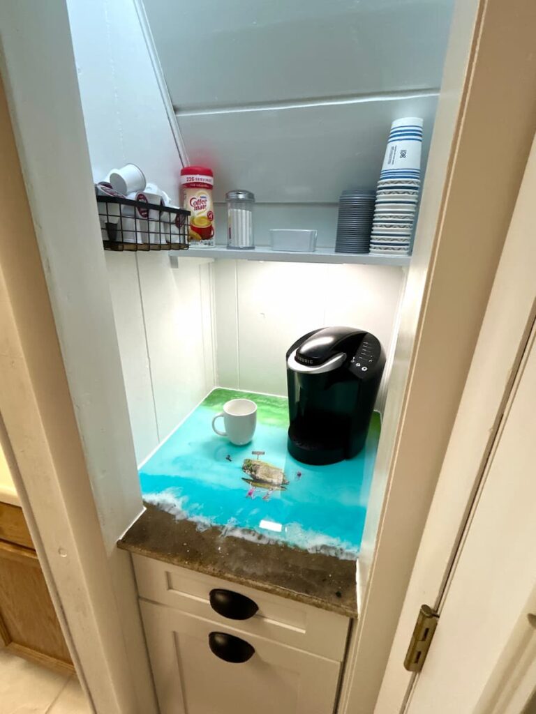 before and after coffee bar makeover reveal with the beachy countertop and coffee maker