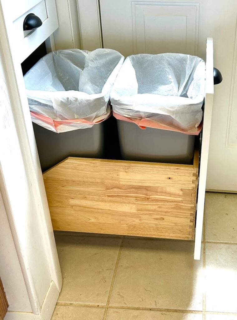 I also solved our trash and recycling dilemma, and it’s hidden out of sight in the cabinet.