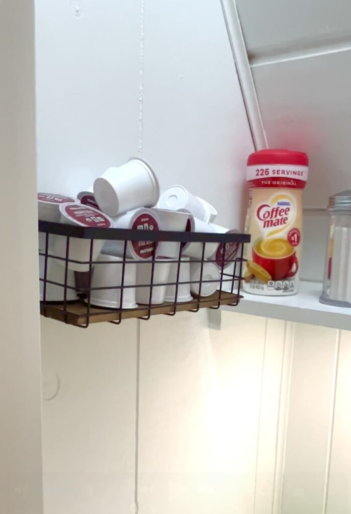 Then, I mounted a wire basket to the wall for Greg’s coffee pods. I knew I should’ve purchased two – don’t you hate when you do that?