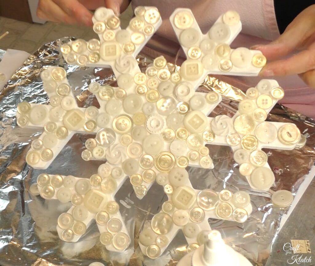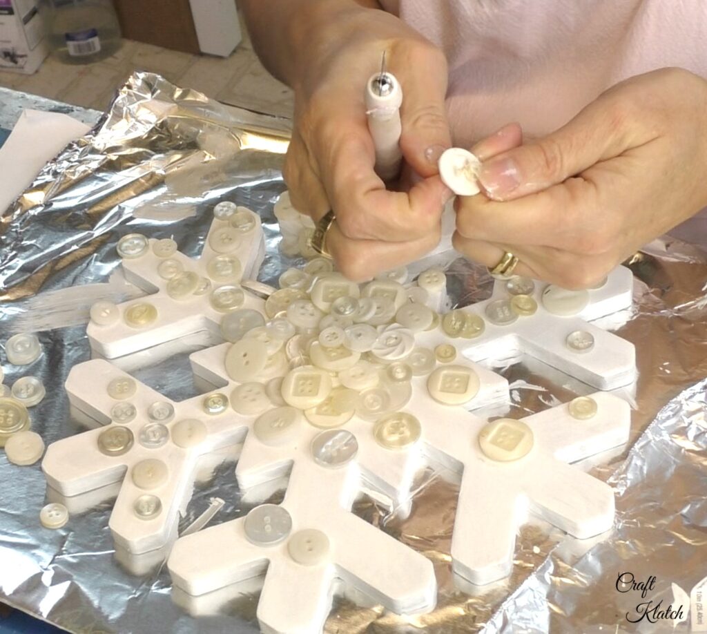 6.  I dipped the individual buttons into glue and placed them on the snowflake.