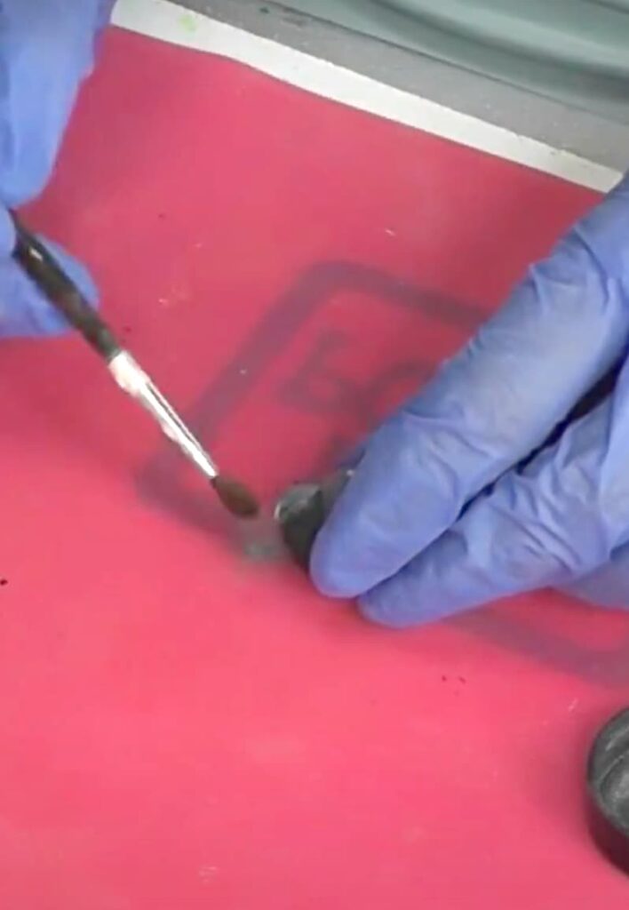 Brushing the base of the crystal ball necklace with silver polymer clay