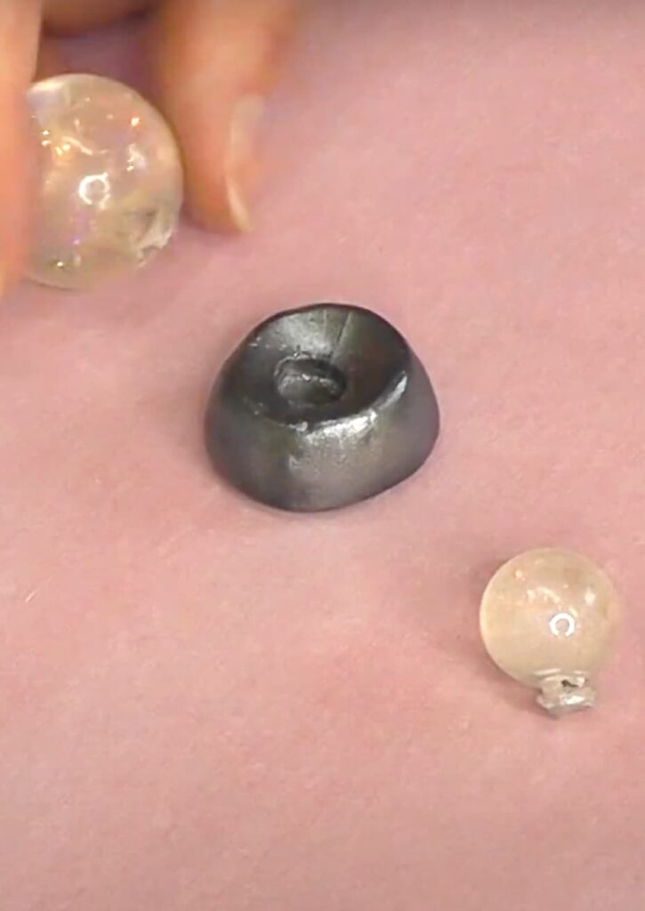 Roll black polymer clay into a ball, press the sphere into it to form a snug base, and shape it as desired. Add pigment powder to the clay for a mystical metallic finish.
