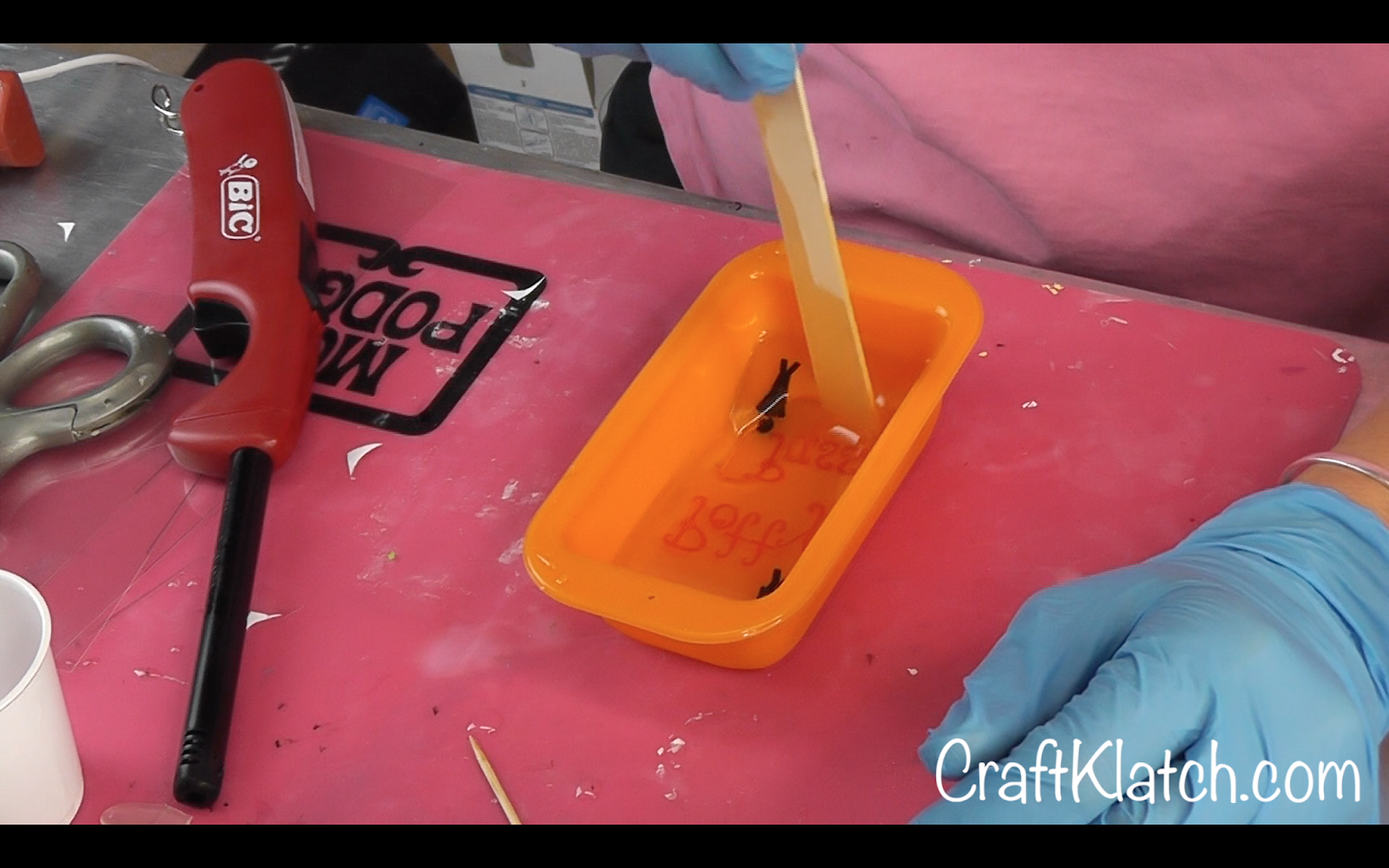 5.  Slide your design into the resin.  Using your stir stick, press the transparency film down, making sure you have pushed out all of the bubbles.
