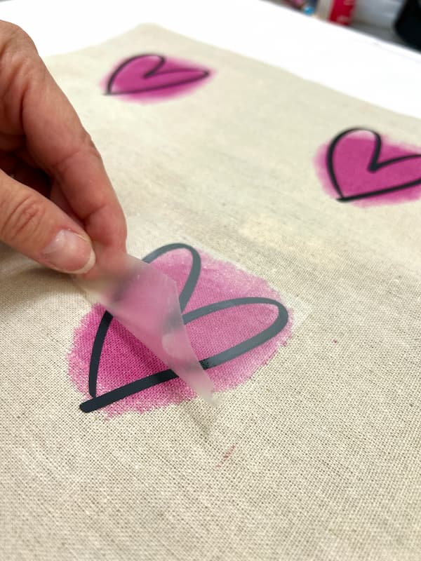 Place the black heart outlines over the painted blobs on the pillow cover. Use a heat press or iron to adhere the hearts to the cover. I used 315°F for 15 seconds on my heat press.