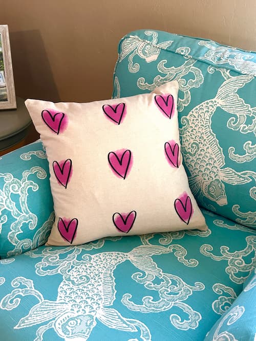 With colorful painted heart designs, this pillow is a quick and easy project to brighten any space.
