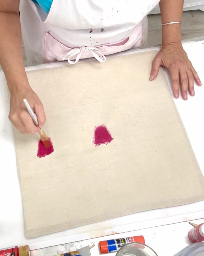 Place a piece of poster board cut to size (or foil, wood, or plastic) inside the pillow cover to prevent bleedthrough. Use the color wash tint to paint blobs on the cover. The shapes are very rough, rough heart blobs.