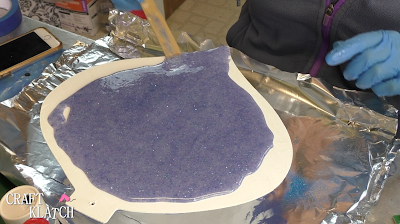 Pour the glitter resin over the painted and taped ornament, spreading it evenly to the edges. Let some resin slightly overflow to ensure smooth edges.