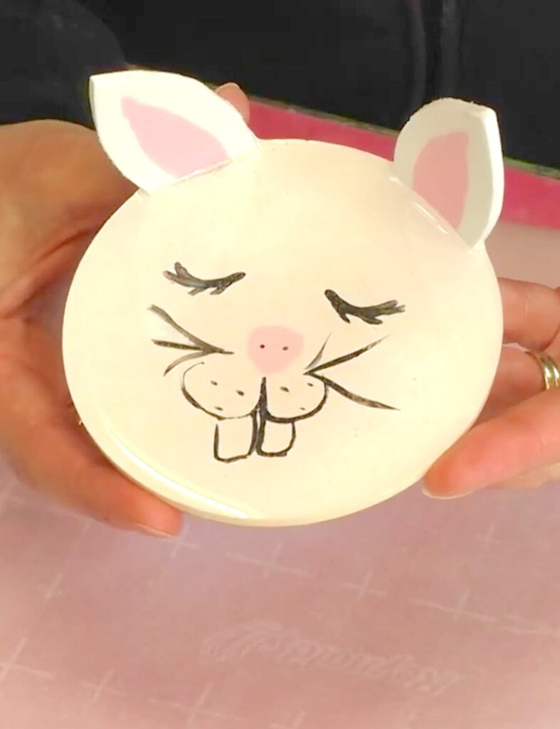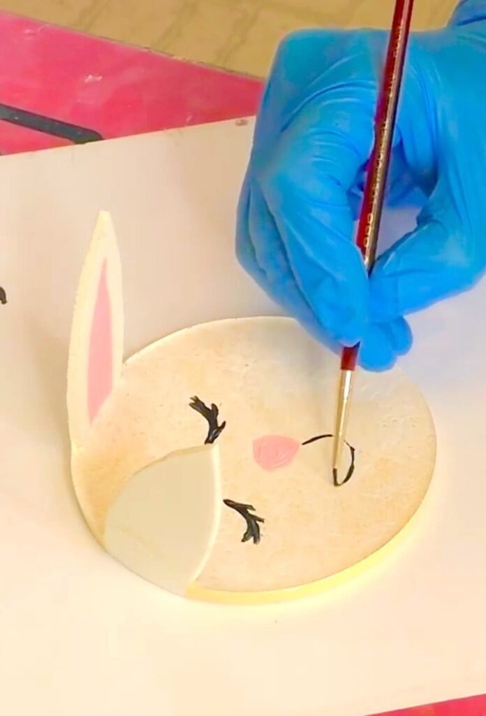 Once the paint is dry, use black and pink acrylic paint to add the bunny’s face. Let it dry completely before moving on.
