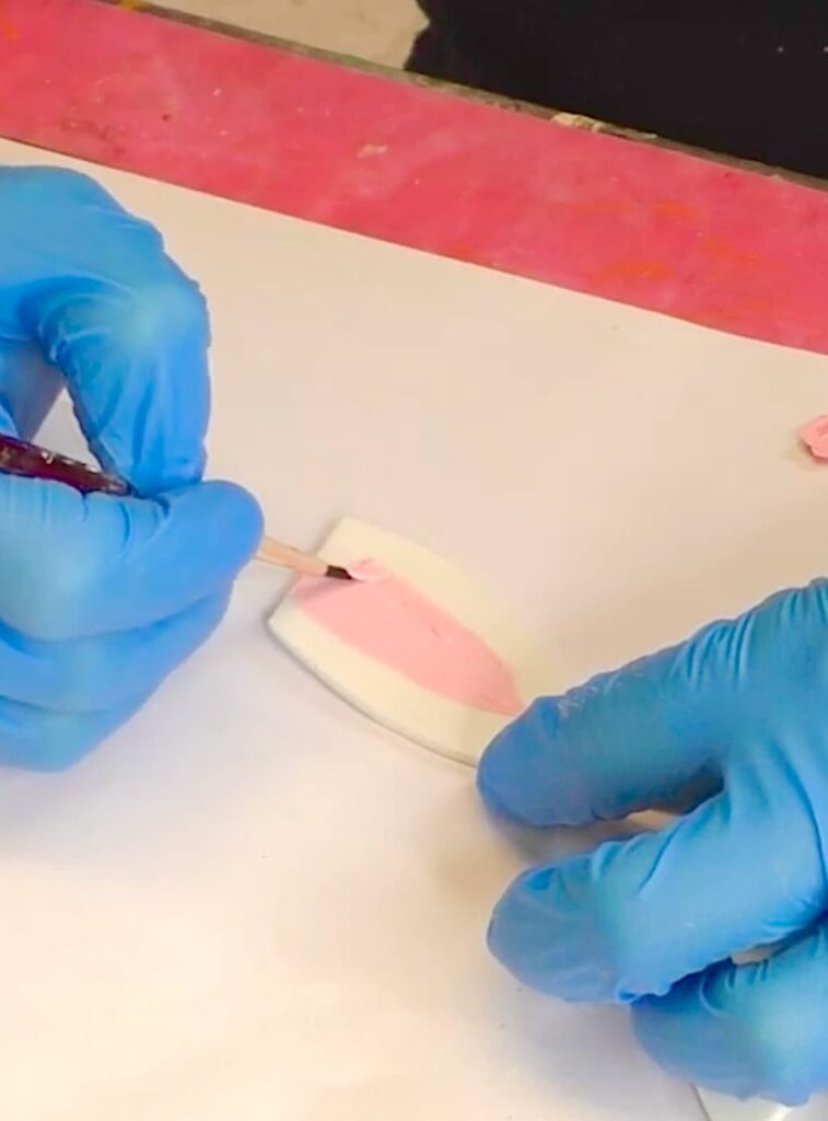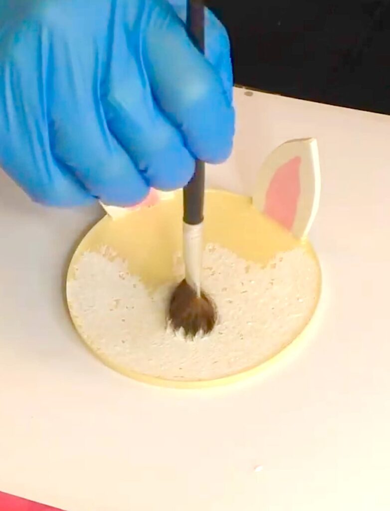 After about 15 minutes, remove the piece from the mold. It may not be fully cured, but it should be firm enough to handle. If the resin isn’t completely white, use white acrylic paint to pounce over the surface. This not only corrects the color but also gives it a cute, furry texture.