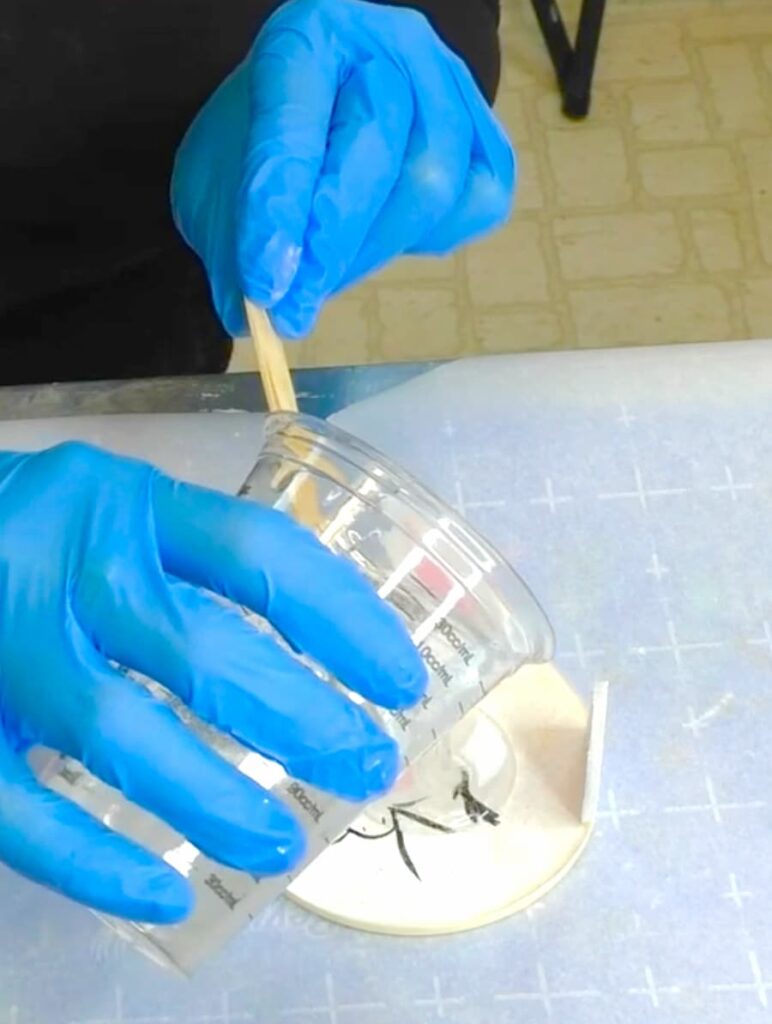 Mix clear resin and pour it over the bunny, carefully guiding it to the edges. Use a lighter to pop any bubbles, but be careful not to get too close to the ears as they might melt. Let it cure for at least 12 hours.