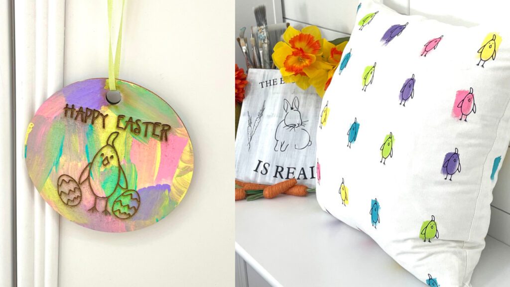 It can be your drawings, your kids or grandkids’ drawings. Even though the art style is easy and rather basic, when it gets put onto a pillow like these Easter heat transfers were, or if you engrave it, they become so much more special and they look like something you would buy in a store.