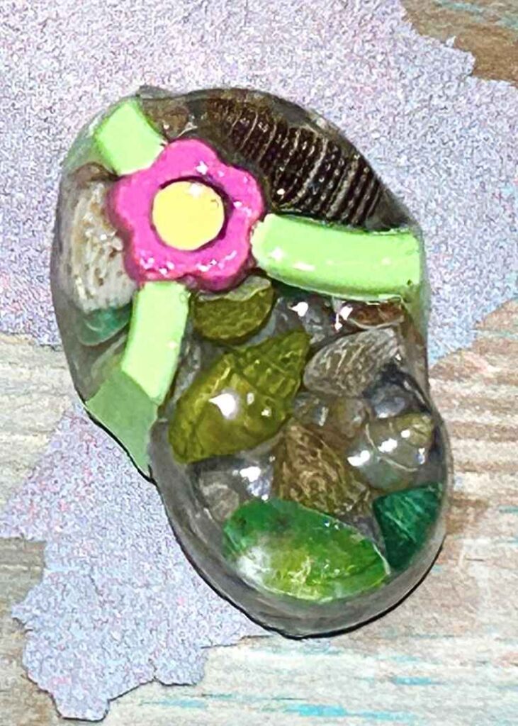 I brushed the UV resin on and used a UV light to cure it. When you look at it now, you can see all the beautiful shells inside!