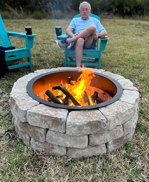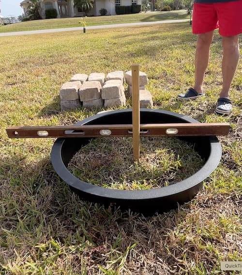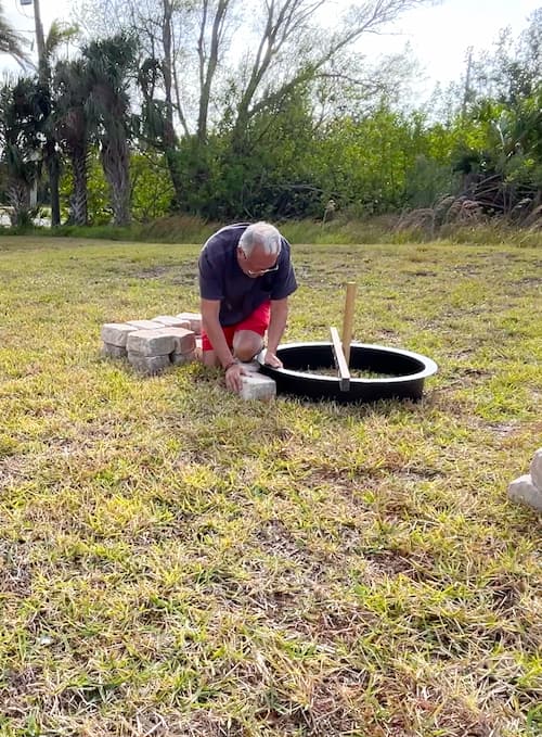 Greg figured out this easy way to do it. We laid the fire pit ring where we wanted it and then laid the bricks around it and tucked them under the lip. That ensured we had them round and perfectly placed for the size.