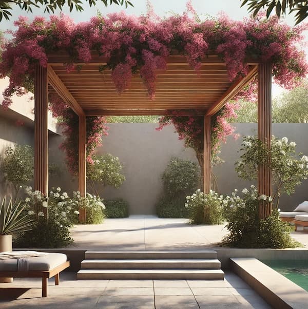 I’m seeing a large pergola draped in vibrant bougainvillea, a cozy patio area, and plenty of space for gatherings.